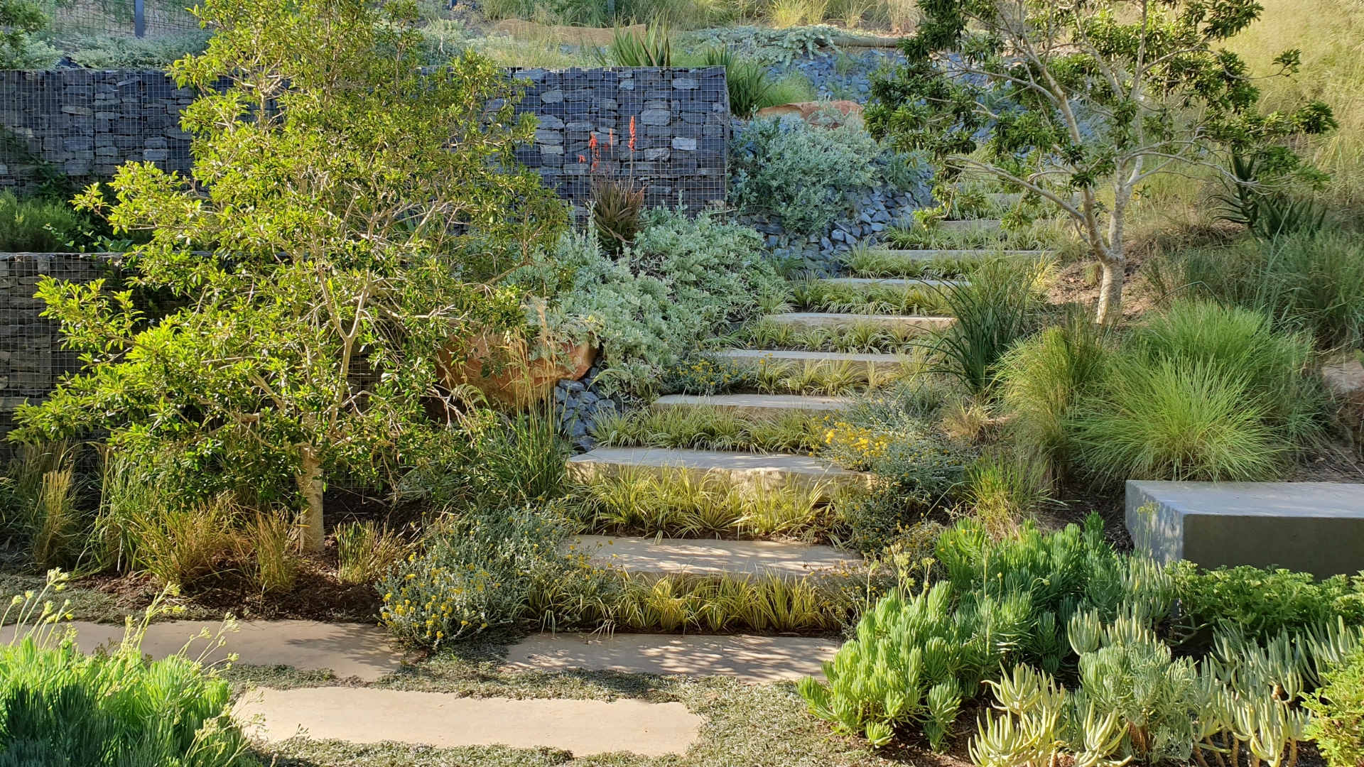 At the core of this garden's design is an entirely indigenous and water-wise plant palette, meticulously chosen to thrive in the dry summer months and minimise the need for long-term water inputs.