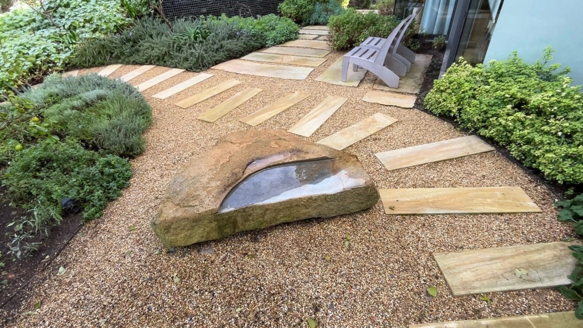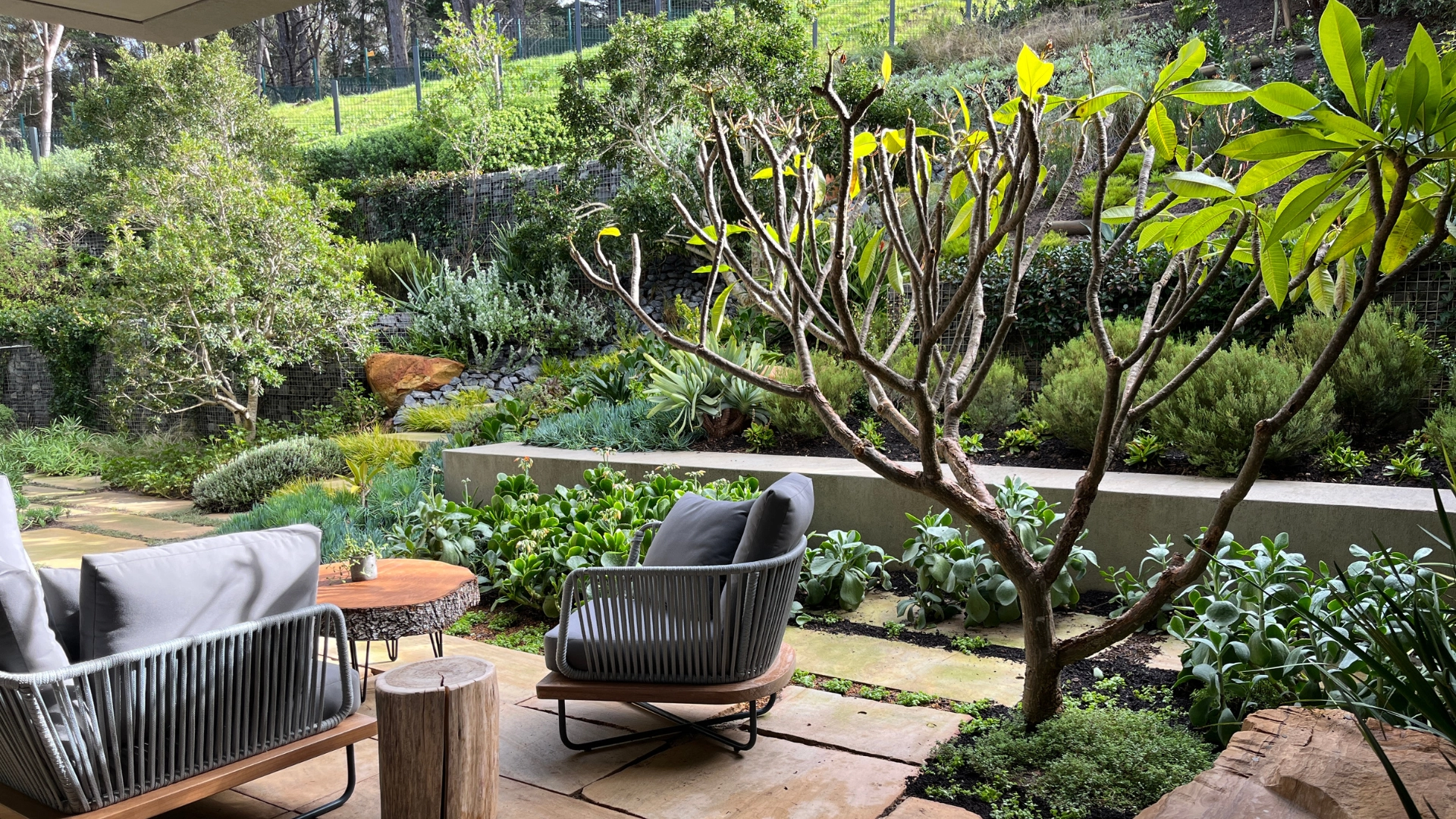 - Natural Stone Integration: Over 20 tonnes of boulders were hand-selected and crane-placed to anchor the garden into the slope. These stone elements function as both visual weight and natural retaining structures, giving the landscape its distinctive mountain character.