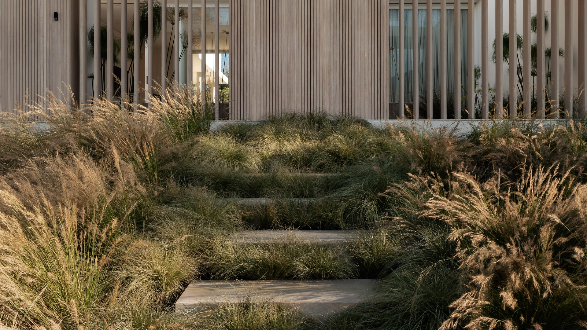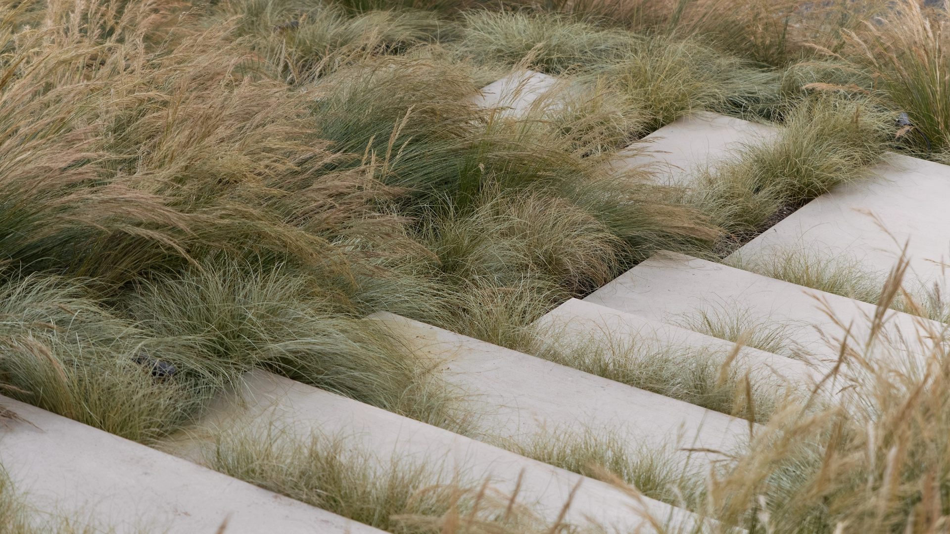 - Plant Palette: The entire planting scheme is pared down to fewer than ten species, using grasses such as aristidia and carex grass for their refined movement and soft texture.